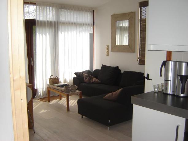 Veranda met hoekbank en stoelen. geheel licht overdekt